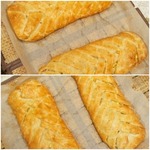 Весь пирог смазать желтком и очень аккуратно перенести на противень, застеленный пекарской бумагой или просто смазанный жиром. Я делаю это при помощи длинной узкой лопатки.