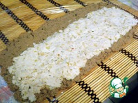 Вторым слоем выкладываем куринный фарш, оставляя свободной полосу печеночного фарша шириной примерно 2-3 см. |