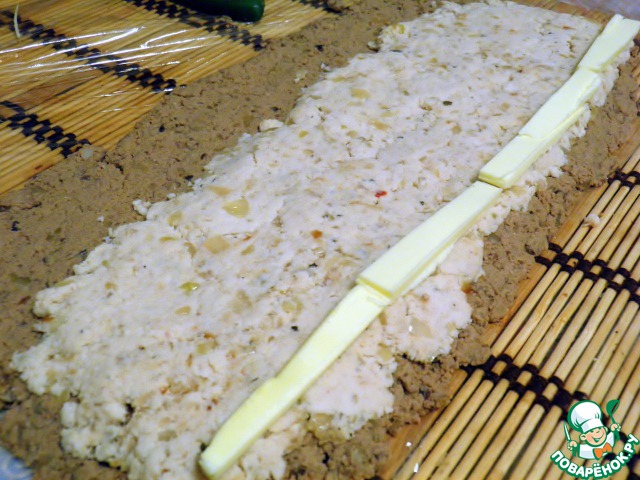 Масло или сыр нарезаем тонкими длинными брусочками и выкладываем полосой на куриный фарш с одного края. |