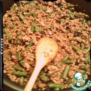 Когда фасоль и фарш будут готовы, соединить, добавить томатную пасту, соль, перец, имбирь, кориандр. Влить 0,5 стакана подсолнечного масла.