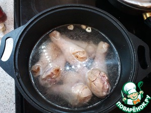 Ножом делаем надрезы и кладем туда чеснок предварительно нарезанный (2 зубчика хватит), далее помещаем все в кастрюлю, вода должна покрывать курицу и варим минимум 50 мин. В это время будет чем заняться!