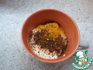 Берем 4-6 ст. л. сметаны, 1 ч. л. куркумы 1 ч. л. черного молотого перца и перемешиваем с приправой я брал для мяса, (аромат не передоваемый) мне брат из Ставрополя привёз, Можно купить на всех рынках, там где приправы в россыпь продают (Кавказ, Азия и т. д)