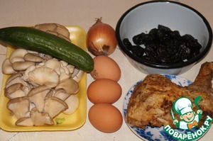 Лук измельчить, мясо нарезать кубиками, немного посолить и поперчить. Грибы нарезать ломтиками. С чернослива слить воду и нарезать его полосками. Яйца и огурец натереть на крупной терке. С огурца отжать лишний сок.