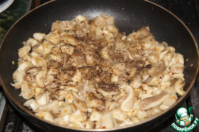 Посолить, поперчить и обжарить до готовности. Сок должен выпариться. Остудить.