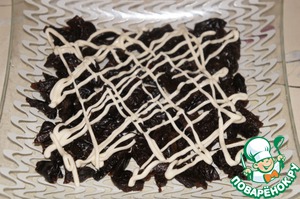 На плоское блюдо выложить чернослив. Нанести сеточку из майонеза.