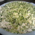Равномерно распределить яйца. Поверх яиц нанести сеточку немного погуще.