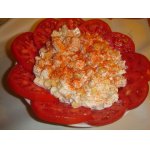 Украсить салат грибочками, дольками вареного яйца, полосками красного болгарского перца.