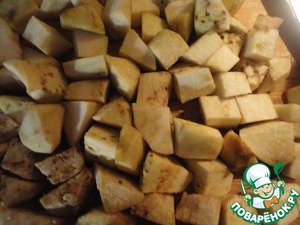 Баклажаны (у меня на это блюдо ушло 4 небольших) режем достаточно крупными кубиками.