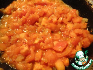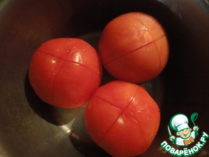 Помидоры (увы, в это время они уже тепличные и относительно дорогие, но уж очень это блюдо приготовить хотелось) надрезаем крестом, заливаем кипятком, отставляем на 2-3 минуты и снимаем шкурку. Режем крупными кубикаи.
