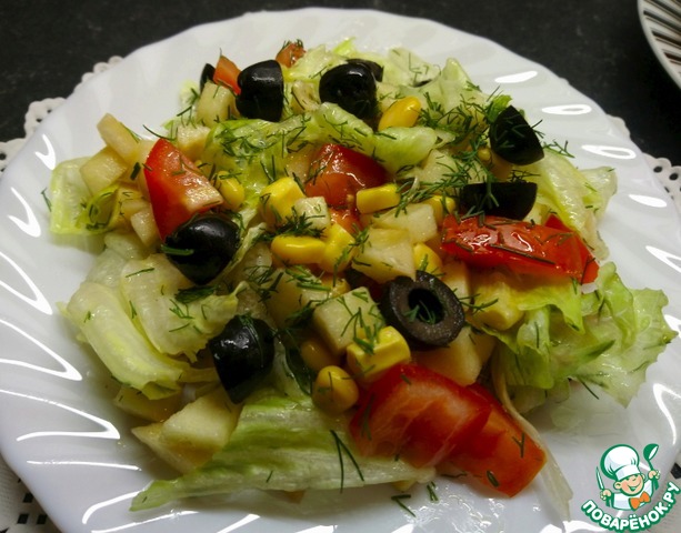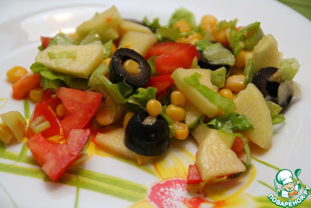 Порезать помидор, 4-5 листьев салата, разрезать маслины пополам, добавить яблоки, кукурузу и смешать все ингредиенты.