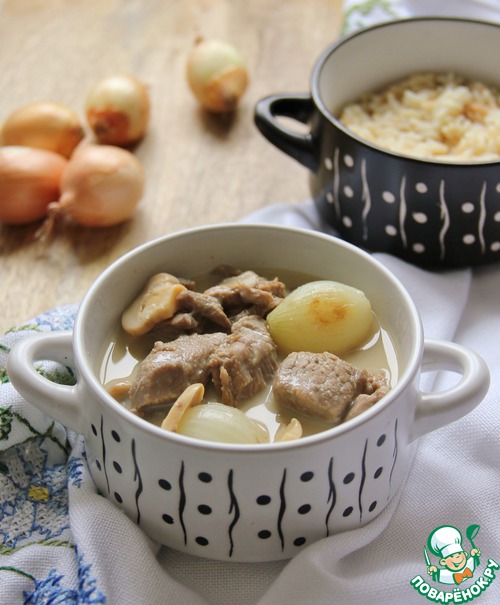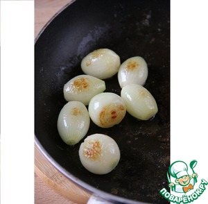Луковички обжарить на сливочном масле с сахаром и щепоткой соли. Когда они зарумянятся, добавить полстакана воды и потушить 15 мин. Если у вас таких луковичек не найдется, не пропускайте этот этап, замените репчатым луком достаточно сладкого сорта, который просто нашинковать. Карамелизированный лук придает блюду очень интересный вкус.