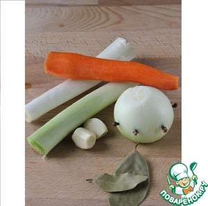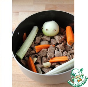 В кастрюлю с мясом добавить лук-порей, в головку репчатого лука втыкаем гвоздику, морковь, чеснок, лавровый лист. По возможности добавить тимьян, базилик и розмарин, которые лучше завязать в марлечку. Посолить, поперчить. Залить водой, чтобы только покрывала мясо и овощи, и тушить в течениe 1 ч 30.