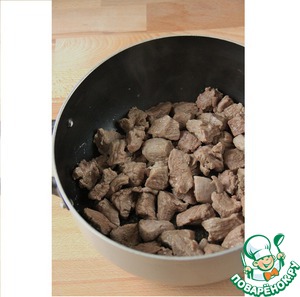 Телятину нарезать на небольшие кусочки и обжарить на сливочном масле. Подлить немного воды, и когда появится пена, эту воду слить (я и кастрюлю вымываю).