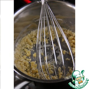 В кастрюле растопить сливочное масло, добавить муку, постоянно помешивая. Затем добавить бульон из мяса (приблизительно 0, 5 л.), продожать помешивать.