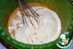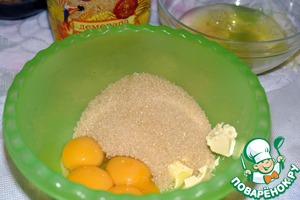 Желтки отделить от белков. К желткам добавить сахар и масло. Все растереть, можно с помощью миксера, можно просто венчиком, взбивать не обязательно. Сахар нужен именно коричневый, так как он придает приятный карамельный вкус, да и полезнее рафинированного.