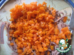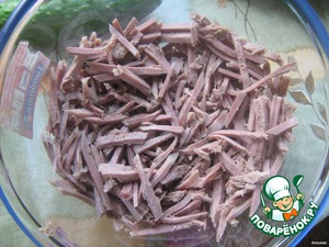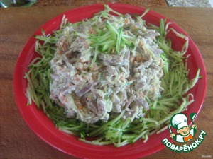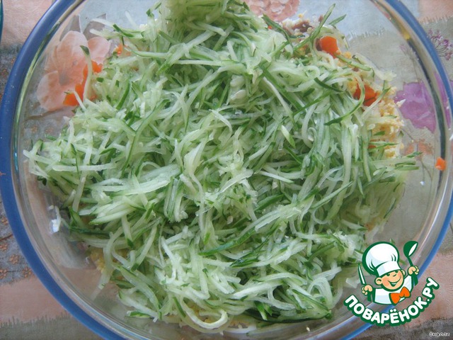 Огурец натереть на тёрке для корейской моркови или нарезать тонкой лапшой (удалить жидкость).
