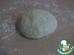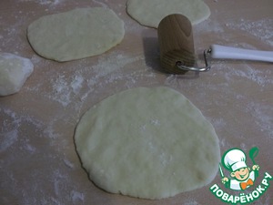 На подпыленной мукой рабочей поверхности раскатываем каждый кусочек (шарик) теста диаметром 12 см.