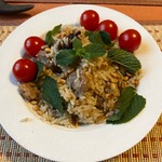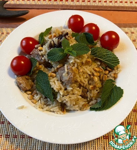 Снимите сковороду с огня и дайте пилаву отдохнуть под крышкой 15 минут. А теперь можно и угощать! Раскладывайте по тарелкам и не забудьте каждую порцию посыпать сверху кедровыми орешками и украсить листиками мяты или петрушки!