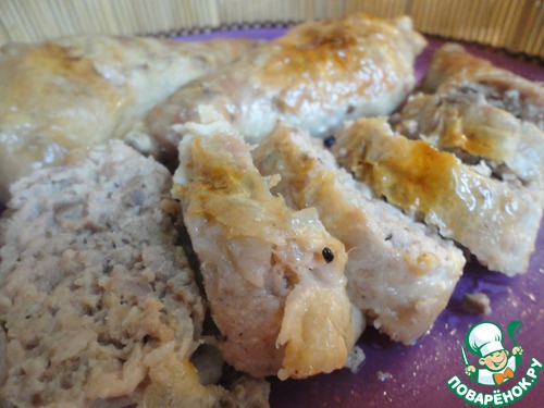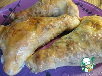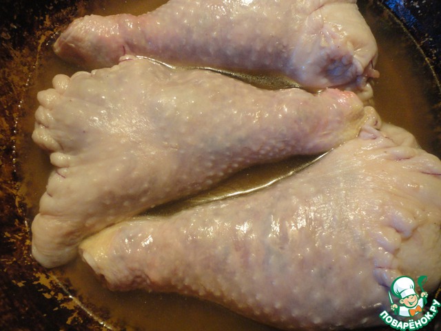 Я отметила принадлежность к еврейской кухне. Дело в том, что, как рассказывала автор этого рецепта, еврейские хозяйки именно таким образом готовили свои знаменитые фаршированные куриные шейки. Но найти достаточное количество шеек не всегда удается, так почему же не использовать окорочка?! Даже не знаю, в какую категорию поместить это блюдо. Ведь его можно употреблять как горячим, так и как холодную нарезку. Конечно, классика - холодная нарезка, но у меня в семье ножки до этого состояния не дожили. В общем, угощайтесь!