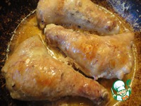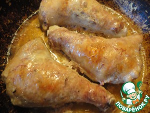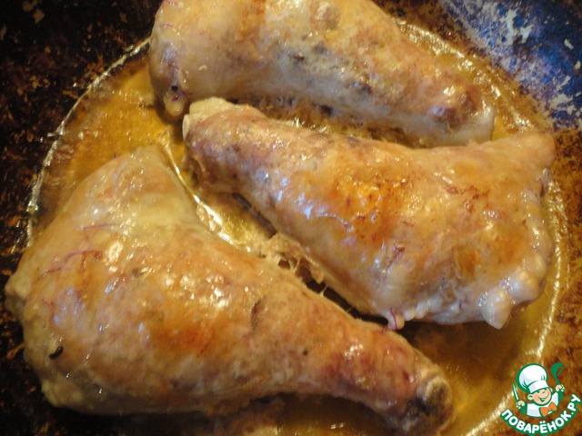Обратите внимание - в сковороде, в которой запекались окорока, остался только жир. Весь бульон частично выпарился, а частично пропитал окорочка. |