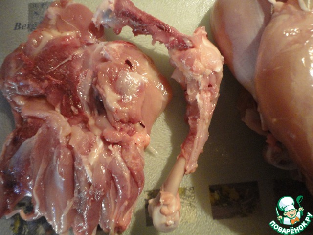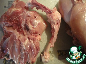 С окороков аккуратно снять шкуру. Удобнее всего это делать ножницами. Чтобы ее не порвать, пленочку, соединяющую мясо и шкуру, нужно подрезать возле мяса. |