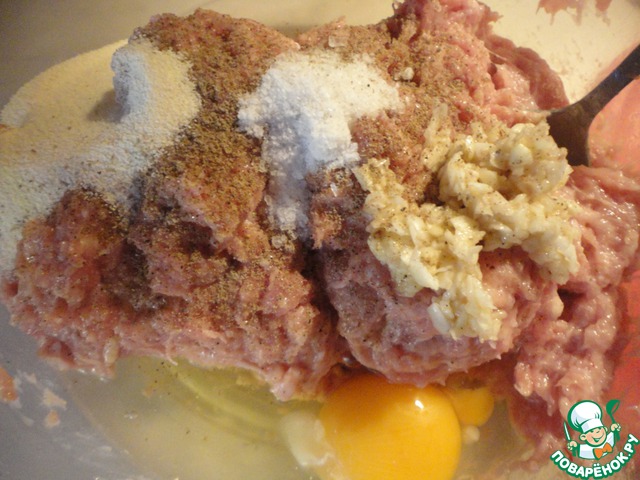 В фарш добавляем соль, перец, яйцо, манку, давленый чеснок. Хорошо вымешиваем. |