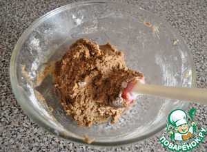В другой миске 200 гр сливочного масла растереть с 120 гр сахара. Добавить 1 яйцо, перемолотые в кофемолке орехи, ванилин, 1 ст. ложку какао и 20 гр темного рома (или коньяка) - все перемешать, добавить постепенно муку и соду, гашенную уксусом.