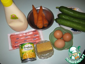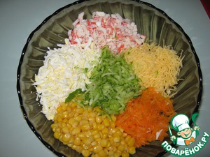Мне больше нравится второе, т. к. после разморозки я отжимаю воду из крабовых палочек, чтобы не было лишней влаги в салате. Добавляем кукурузу, огурцы (на терке), которые остались после нарезки свечек. -