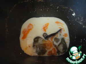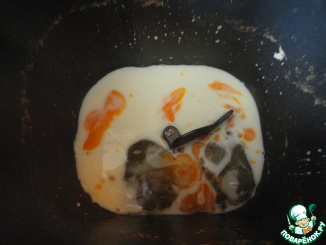 В моей хлебопечи по инструкции сначала выкладываются жидкие, затем твердые ингредиенты. В чашу хлебопечи вливаем молоко, вбиваем яйца.