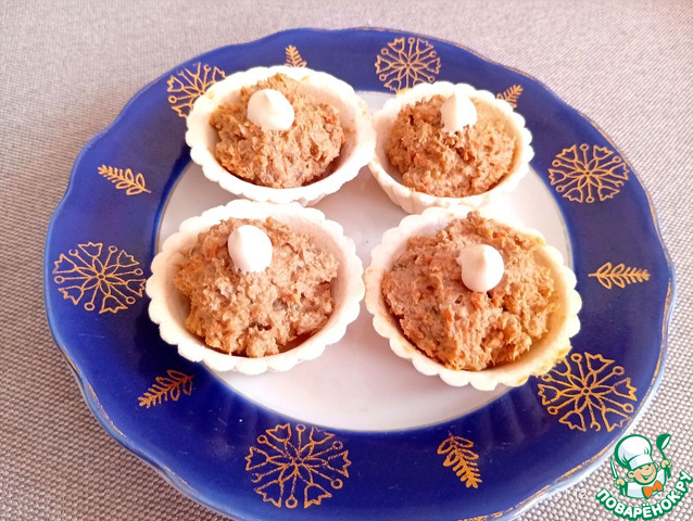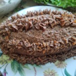 На полиэтиленовый пакет разложить тонким слоем печеночную массу. Смазать ее сливочным маслом и скатать рулетиком, используя пакет.