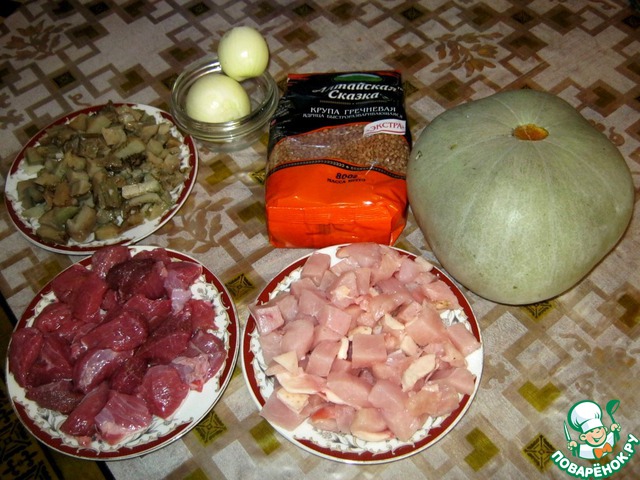 • Нам понадобится небольшая тыковка, мясо, грибы, лук, гречка.