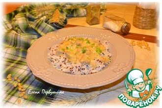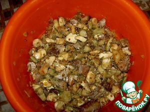 • Гречку помыть и перемешать с обжаренным мясом и грибами, посолить, поперчить.