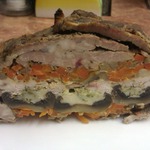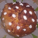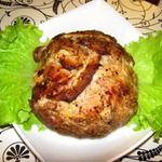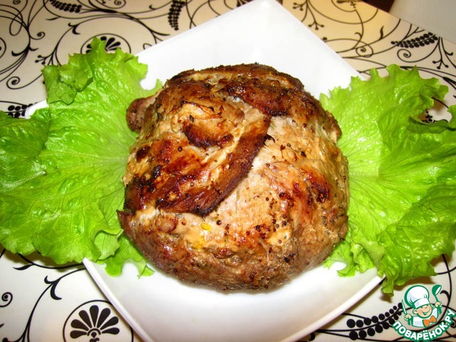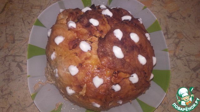 Запекать пришлось дольше - час с небольшим. При этом сделала так: когда уже без фольги верхушка подрумянилась, я шар вытащила, путём махинаций перевернула его в форму вверх тормашками - при этом вылилась жидкость; затем подрумянила (точнее, подсушила) низ, который оказался сверху, и тогда уже выложила (при переворачивание снова жидкость лишняя вылилась.