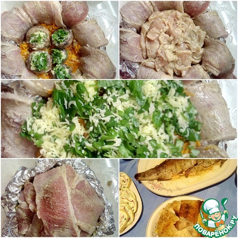 Укладываем филе свинины внахлест, края должны свисать из формы. -