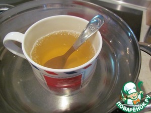 Желатин замочить в стакане холодной кипяченой воды на 10 мин. Когда разбухнет, опустить чашку с желатином в горячую воду и размешать до полного растворения желатина. Желатин охладить в холодной воде и ввести в приготовленную массу.