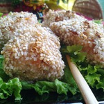 Рыбу обваливаем в кунжуте (лучше всего смесь белого и чёрного кунжута). У меня чёрного не было, и я добавила к кунжуту зерновую смесь. И выкладываем на противень.