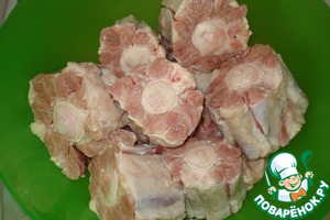 Хвост нарезать по хрящевым соединениям на куски и замочить в холодной воде на 2-3 часа, а лучше на ночь.