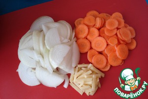 Режем лук полукольцами, морковь - колечками и имбирь - брусочками.