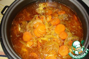 Добавляем воду, томатную пасту, горчицу, специи, солим, перчим. Закрываем крышку. Выставляем режим "ТУШЕНИЕ" на 3,5-4 часа и занимаемся своими делами.