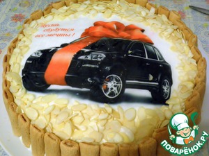 Верх украсила вафельная картина. Муж недавно получил права и теперь мечтает о машине, поэтому и тематика картинки была соответствующая. Работать с такими картинками - одно удовольствие. Все, что нужно, это нанести на торт крем (он у нас уже имеется), положить картинку на поверхность готового торта и аккуратно разгладить для удаления воздушных пузырьков.