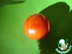 Берем помидор и кладем его на доску плодоножкой вниз. Делаем 4-5 надрезов, до конца не дорезаем. Можем заготовить помидоры таким образом заранее, положить их в холодильник.