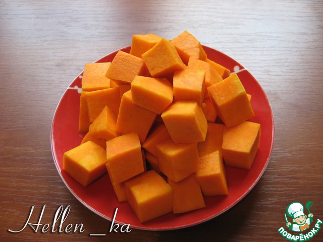 Тыкву чистим и нарезаем мякоть кусочками.