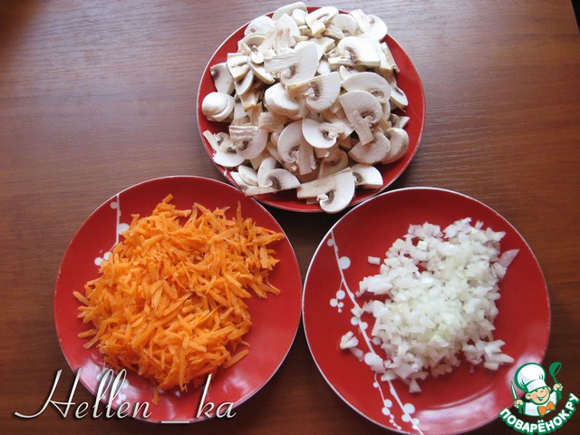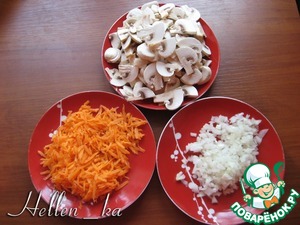 Шампиньоны нарезаем ломтиками, морковь трем на крупной терке, лук мелко порубим.