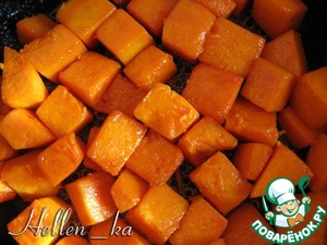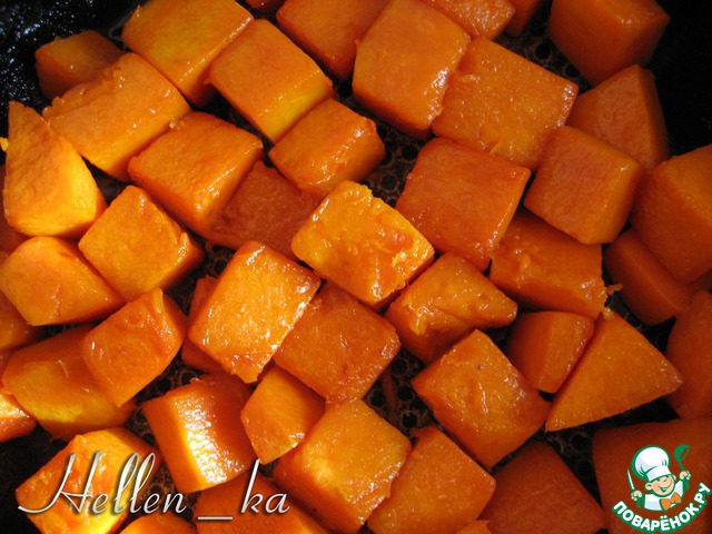 20 г сливочного масла растопим на небольшом огне в сковороде, затем добавим кусочки тыквы и протушим 10-15 минут, часто помешивая (крышкой не накрываем!)