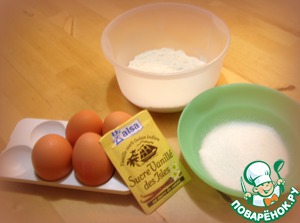 Подготовим ингредиенты для бисквита "женуаз". Мука, сахар, яйца.