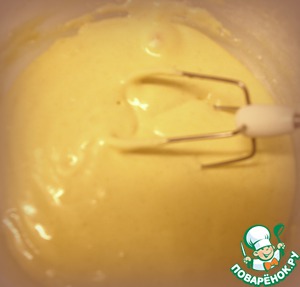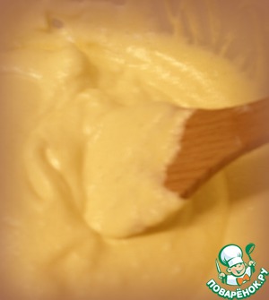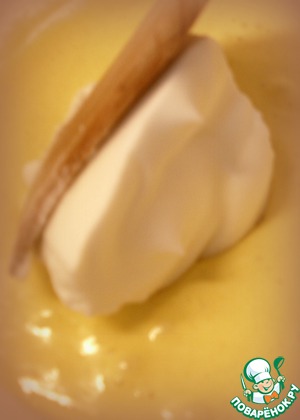 Желтки (4 шт) взбить с сахаром (50 гр плюс один пакет ванильного сахара) до побеления массы.