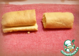 А потом каждую часть разрезать пополам поперек. Обрезать неровные края и свернуть рулетиками.