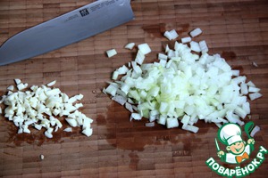 В нескольких столовых ложках растительного масла поджарить лук и чеснок на небольшом огне, до прозрачности.