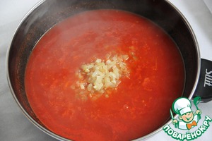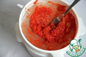 Если под рукой нет пассерованных томатов, то томаты в собственном соку протереть через сито. (Жмых оставить для бульона!)