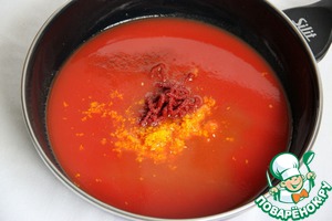Соус: Пассерованные или протёртые вместе с соком томаты соединить в глубокой сковороде с апельсиновым соком, апельсиновой цедрой, томатной пастой, довести до кипения, добавить соль и кайенский перец (аккуратно с перцем, не переборщить!).
